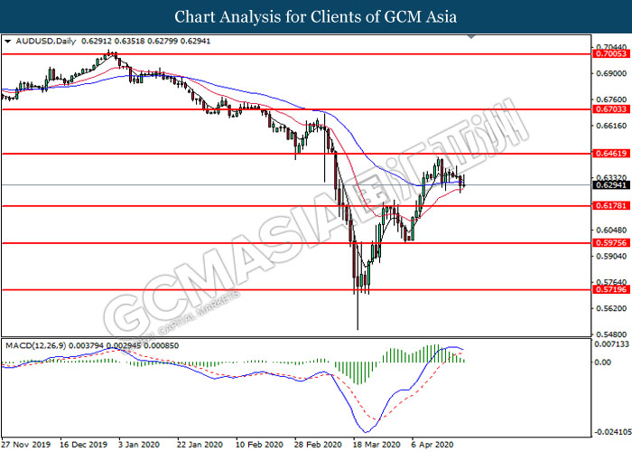 AUDUSD, Daily: AUDUSD was traded lower following prior retracement near the resistance level at 0.6460. MACD which illustrate diminishing bullish momentum suggest the pair to extend its losses toward the support level at 0.6180.