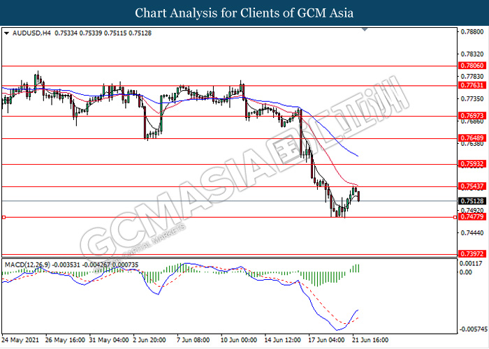 AUDUSD, H4: AUDUSD was traded lower following prior retracement from the resistance level 0.7545. However, MACD which illustrate bullish momentum signal suggest the pair to be traded higher in short term back towards the resistance level 0.7545.