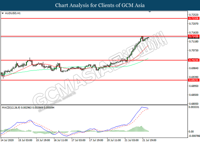 AUDUSD, H1: AUDUSD was traded higher while currently testing the resistance level at 0.7145. However, MACD which illustrated diminishing bullish momentum suggest the pair to be traded lower in short-term as technical correction.