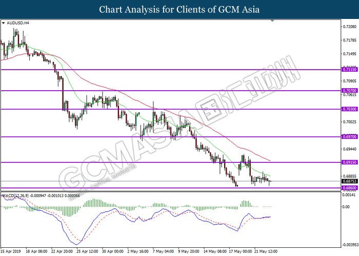 AUDUSD, H4: AUDUSD was traded flat below the 20-MA line (green). Due to lack of momentum and signal from the MACD, a breakout below the support level 0.6860 or resistance level 0.6915 is required for further confirmation before entering the market.