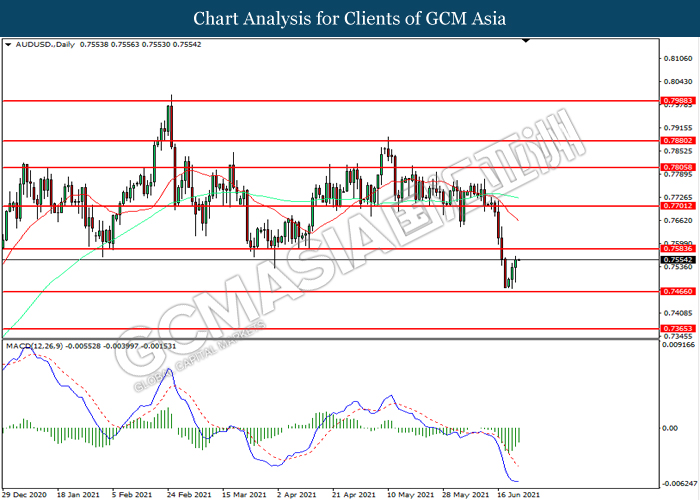 AUDUSD, Daily: AUDUSD was traded higher while currently testing the resistance level at 0.7585. MACD which illustrated diminishing bearish momentum suggest the pair to extend its gains after it successfully breakout above the resistance level.