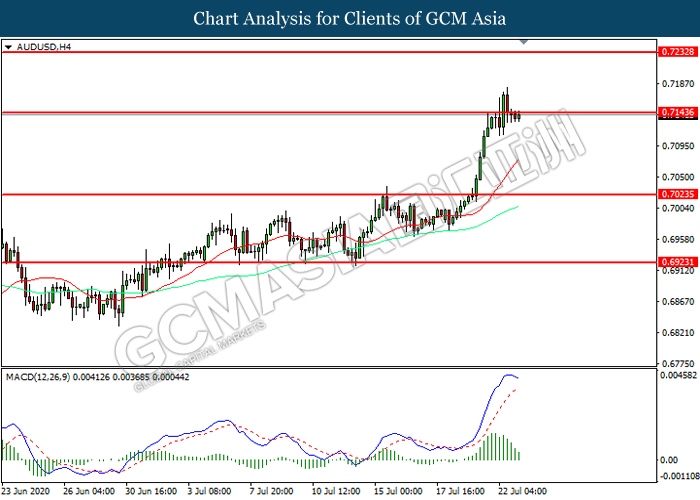 AUDUSD, H4: AUDUSD was traded higher while currently testing the resistance level at 0.7145. However, MACD which illustrated diminishing bullish momentum suggest the pair to be traded lower in short-term as technical correction.