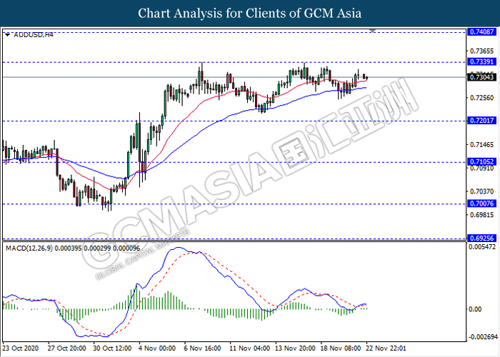 AUDUSD, H4: AUDUSD was traded higher while currently testing near the resistance level 0.7340. MACD which display bullish bias signal suggest the pair to extend its gains after it breaks above the resistance level.