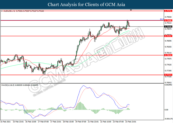 AUDUSD, H1: AUDUSD was traded lower following prior retracement from the resistance level at 0.7940. MACD which diminishing bullish momentum suggest the pair to extend its losses toward support level at 0.7880.