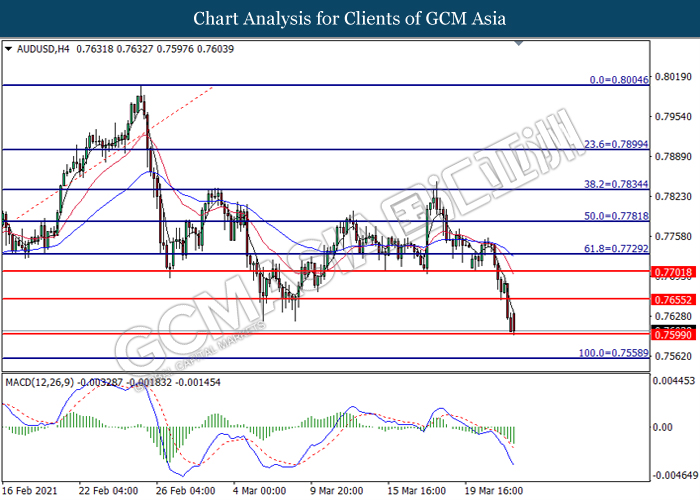 AUDUSD, H4: AUDUSD was traded lower while currently testing the support level at 0.7600. MACD which illustrated bearish bias momentum suggest the pair to extend its losses after it successfully breakout below the support level at 0.7600.