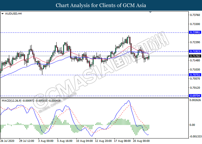 AUDUSD, H4: AUDUSD was traded flat near the resistance level 0.7190. However, MACD which illustrate diminishing bearish momentum signal suggest the pair to be traded higher after it breaks above the resistance level.