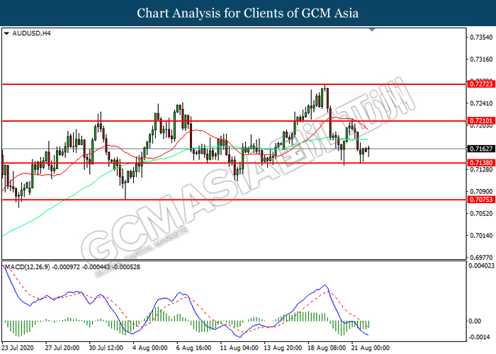 AUDUSD, H4: AUDUSD was traded lower while currently near the support level at 0.7140. However, MACD which illustrated diminishing bearish momentum suggest the pair to be traded higher in short-term as technical correction.