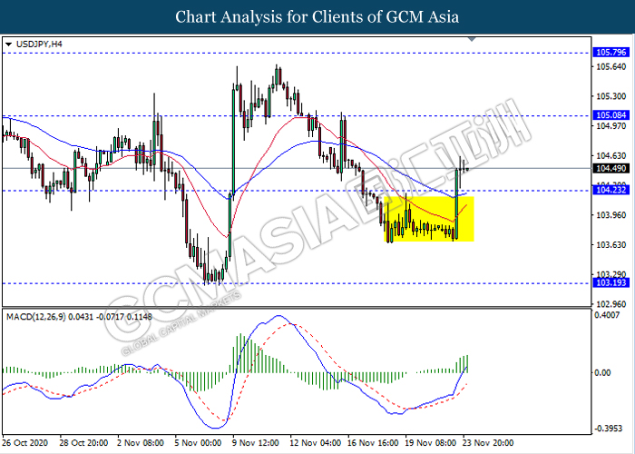 USDJPY, H4: USDJPY was traded higher following prior breakout above the previous resistance level 104.25. MACD which illustrate ongoing bullish momentum signal suggest the pair to extend its gains towards the resistance level 105.10.