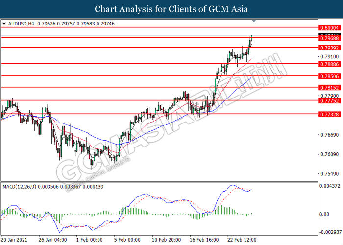 AUDUSD, H4: AUDUSD was traded higher while currently testing the resistance level at 0.7970. MACD which illustrated bullish bias momentum suggest the pair to extend its gains after it successfully breakout above the resistance level.