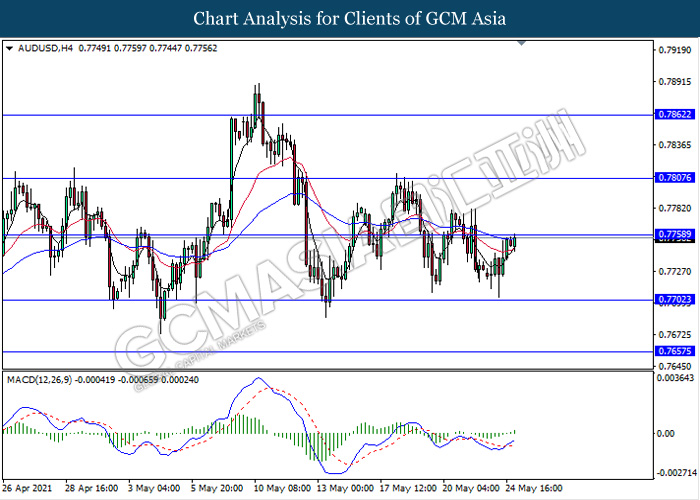AUDUSD, H4: AUDUSD was traded higher while currently testing the resistance level 0.7760. MACD which illustrate bullish momentum signal with the formation of golden cross suggest the pair to extend its gains after it breaks above the resistance level.