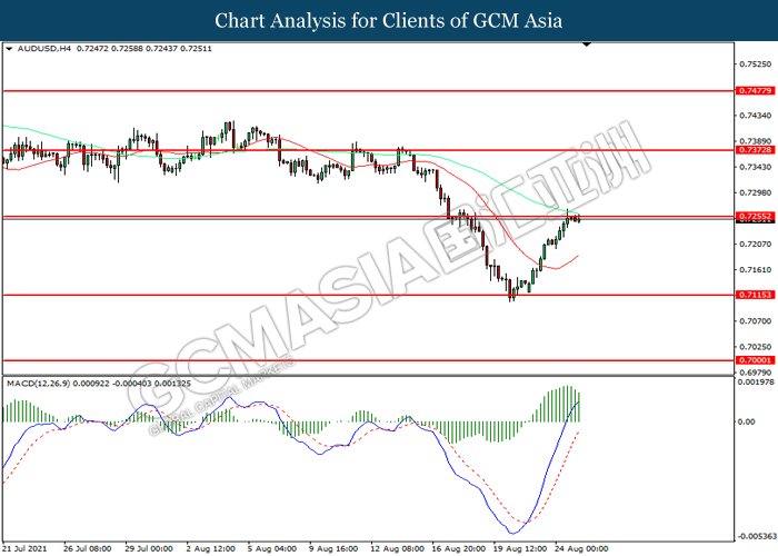 AUDUSD, H4: AUDUSD was traded higher following prior rebounded from the support level at 0.7115. However, MACD which illustrated diminishing bullish momentum suggest the pair to be traded lower in short-term as technical correction.