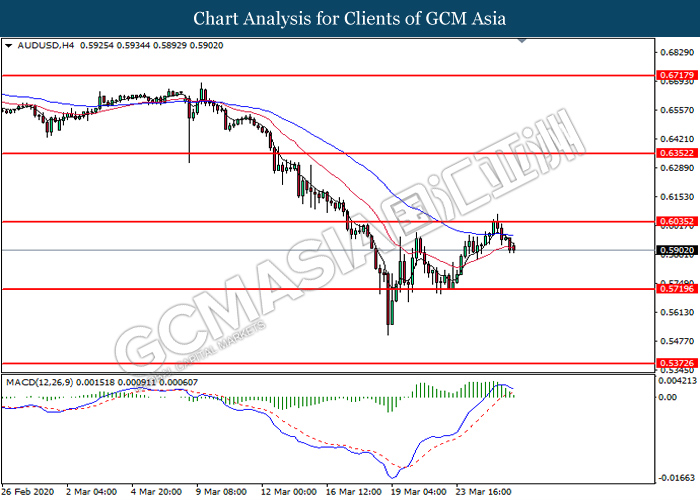 AUDUSD, H4: AUDUSD was traded lower following prior retracement from the resistance level at 0.6035. MACD which illustrate diminishing bullish momentum suggest the pair to extend its losses toward the support level at 0.5720.