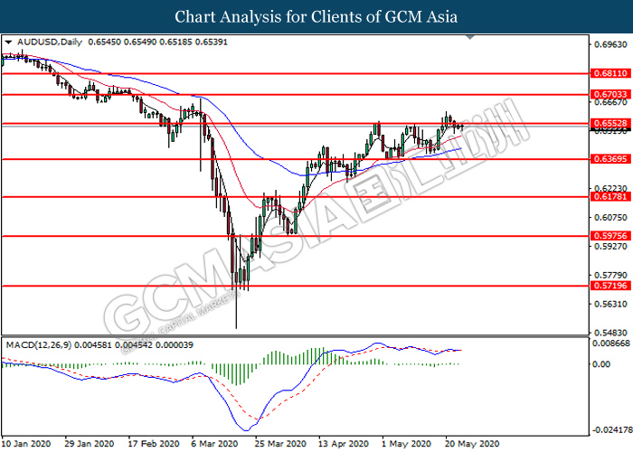 AUDUSD, Daily: AUDUSD was traded lower following prior breakout below the previous support level at 0.6555. MACD which illustrates diminishing bullish momentum signal suggest the pair to extend its losses toward the support level at 0.6370.