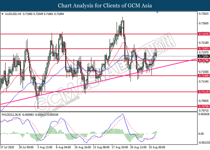 AUDUSD, H4: AUDUSD was traded lower following prior retracement from the resistance level at 0.7205. MACD which illustrate diminishing bullish momentum signal suggest the pair to extend its losses toward the support level at 0.7180.