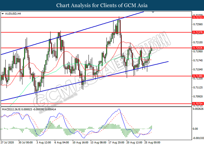 AUDUSD, H4: AUDUSD was traded higher while currently testing the resistance level at 0.7205. MACD which illustrated increasing bullish momentum suggest the pair to extend its gains after it successfully breakout above the resistance level.