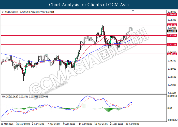 AUDUSD, H4: AUDUSD was traded lower following prior retracement from the resistance level at 0.7815. MACD which illustrated diminishing bullish momentum suggest the pair to extend its losses toward the support level at 0.7760.