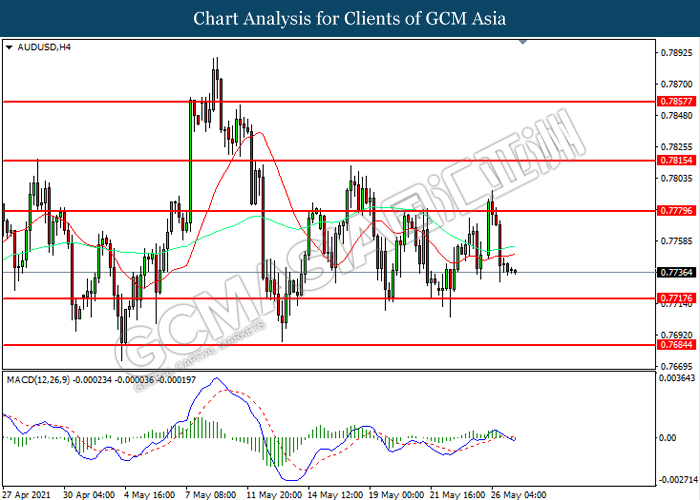 AUDUSD, H4: AUDUSD was traded lower following prior retracement from the resistance level at 0.7780. MACD which illustrated increasing bearish momentum suggest the pair to extend its losses toward support level at 0.7715.