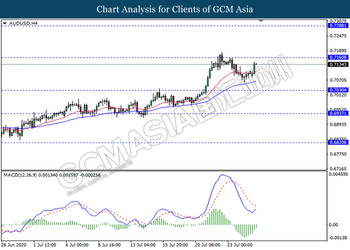 AUDUSD, H4: AUDUSD was traded higher while currently testing the resistance level 0.7160. MACD which illustrate diminishing bearish momentum signal suggest the pair to extend its gains after it breaks above the resistance level.