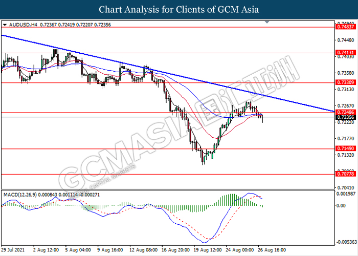 AUDUSD, H4: AUDUSD was traded lower following prior breakout below the previous support level 0.7250. MACD which illustrate bearish momentum signal with the formation of death cross suggest the pair to extend its losses towards the support level 0.7150.