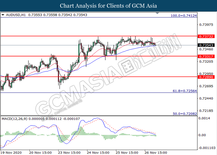 AUDUSD, H4: AUDUSD was traded lower following prior retracement from the resistance level at 0.7375. MACD which illustrate bearish bias momentum suggest the pair to extend its losses toward the support level at 0.7330.