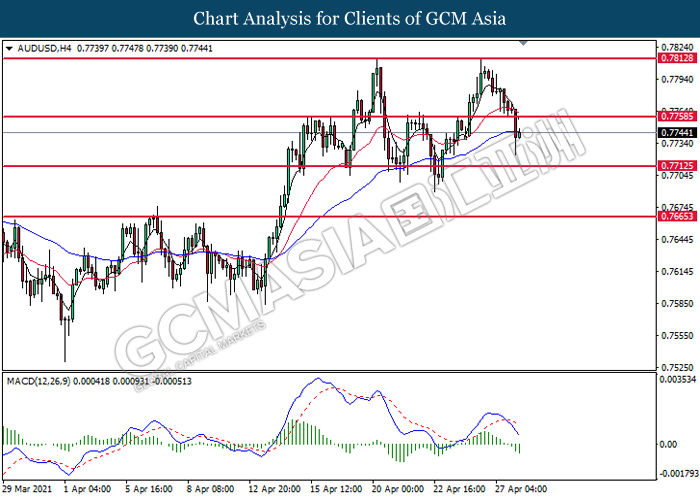 AUDUSD, H4: AUDUSD was traded lower following prior breakout below the previous support level at 0.7760. MACD which illustrated bearish bias momentum suggest the pair to extend its losses toward the support level at 0.7715.