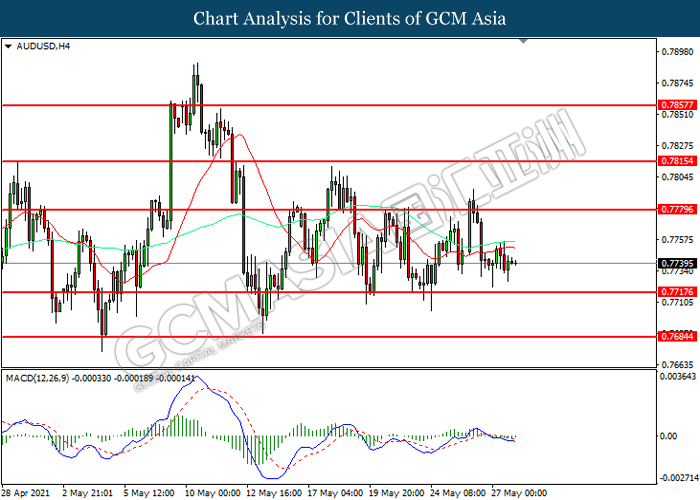 AUDUSD, H4: AUDUSD was traded lower while currently testing the support level at 0.7715. MACD which illustrated increasing bearish momentum suggest the pair to extend its losses after it successfully breakout below the support level.