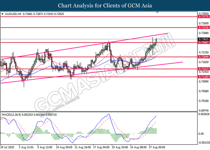 AUDUSD, H4: AUDUSD was traded higher following prior breakout above the previous resistance level at 0.7265. MACD which illustrate bullish bias momentum signal suggest the pair to extend its gains toward the resistance level at 0.7330.