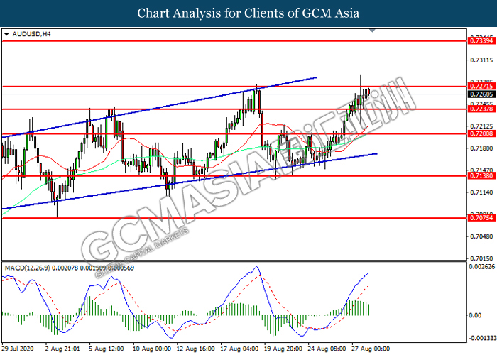AUDUSD, H4: AUDUSD was traded higher while currently testing the resistance level at 0.7270. However, MACD which illustrated diminishing bullish momentum suggest the pair to be traded lower in short-term as technical correction.