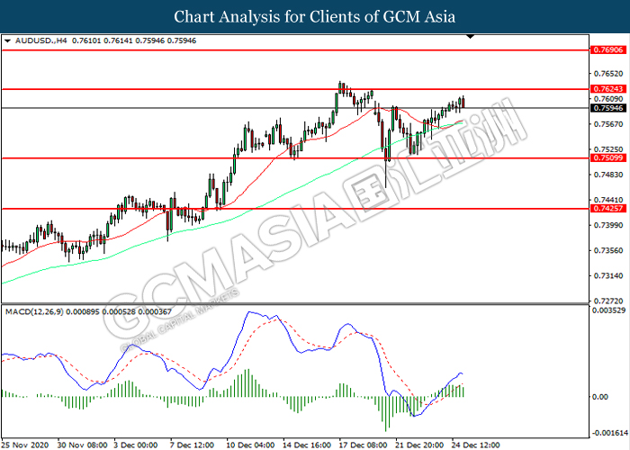 AUDUSD, H4: AUDUSD was traded higher while currently testing the resistance level at 0.7625. However, MACD which illustrated diminishing bullish momentum suggest the pair to be traded lower in short-term as technical correction.