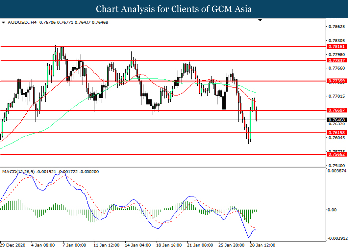AUDUSD, H4: AUDUSD was traded lower following prior breakout below the support level at 0.7670. However, MACD which illustrated diminishing bearish momentum suggest the pair to be traded higher in short-term as technical correction.