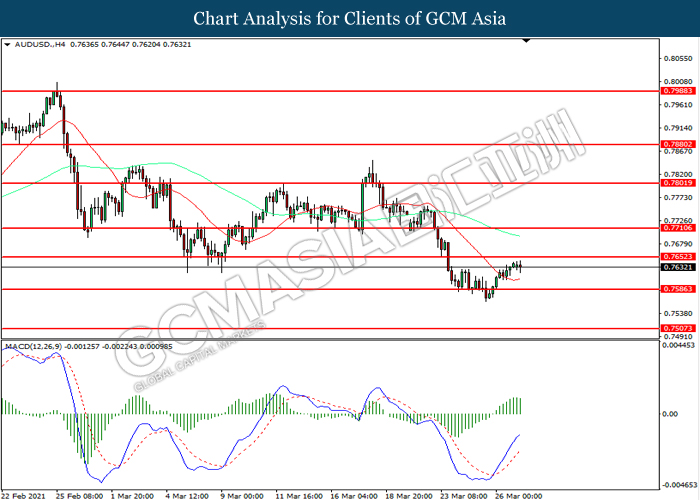 AUDUSD, H4: AUDUSD was traded higher while currently testing the resistance level at 0.7650. However, MACD which illustrated diminishing bullish momentum suggest the pair to be traded lower in short-term as technical correction.