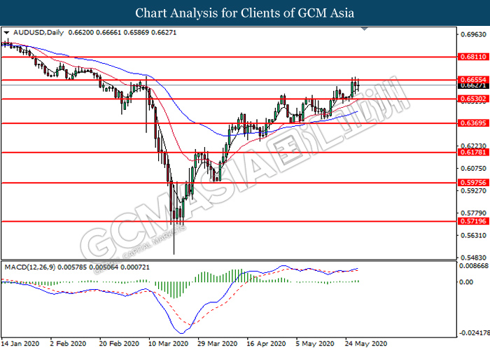 AUDUSD, Daily: AUDUSD was traded higher while currently testing the resistance level at 0.6655. MACD which illustrates bullish bias momentum signal suggest the pair to extend its gains after it successfully breakout above the resistance level at 0.6655.