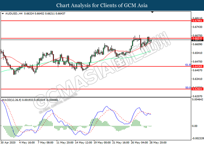 AUDUSD, H4: AUDUSD was traded higher while currently testing the resistance level at 0.6655. MACD which illustrated diminishing bearish momentum suggest the pair to extend its gains after it successfully breakout above the resistance level.