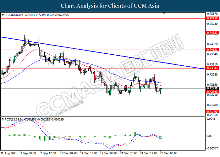 AUDUSD, H4: AUDUSD was traded lower while currently testing the support level 0.7235. However, MACD which illustrate diminishing bearish momentum signal suggest the pair to be traded higher towards the resistance level 0.7335.