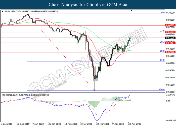 AUDUSD, Daily: AUDUSD was traded higher following prior breakout above the previous resistance level 0.6665. MACD which illustrated increasing bullish momentum suggest the pair to extend its gains toward resistance level at 0.6665.