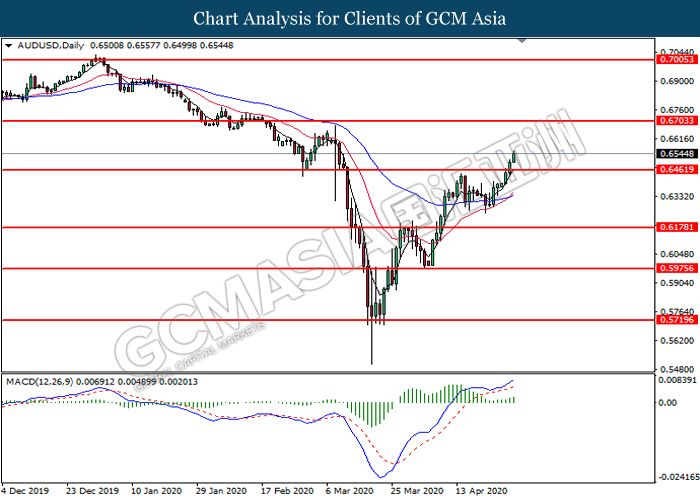 AUDUSD, Daily: AUDUSD was traded higher following prior breakout above the previous resistance level at 0.6460. MACD which illustrate bullish bias momentum suggest the pair to extend its gains toward the resistance level at 0.6705.