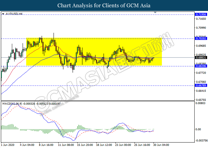 AUDUSD, H4: AUDUSD remain traded in a sideway channel while currently testing near the support level 0.6820. However, MACD which illustrate bullish momentum with the starting formation of golden cross suggest the pair to be traded higher towards the resistance level 0.7020.