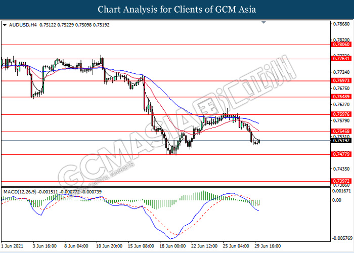 AUDUSD, H4: AUDUSD was traded lower following prior breakout below the previous support level0.7545. MACD which illustrate bearish bias signal suggest the pair to extend its losses towards the support level 0.7475.