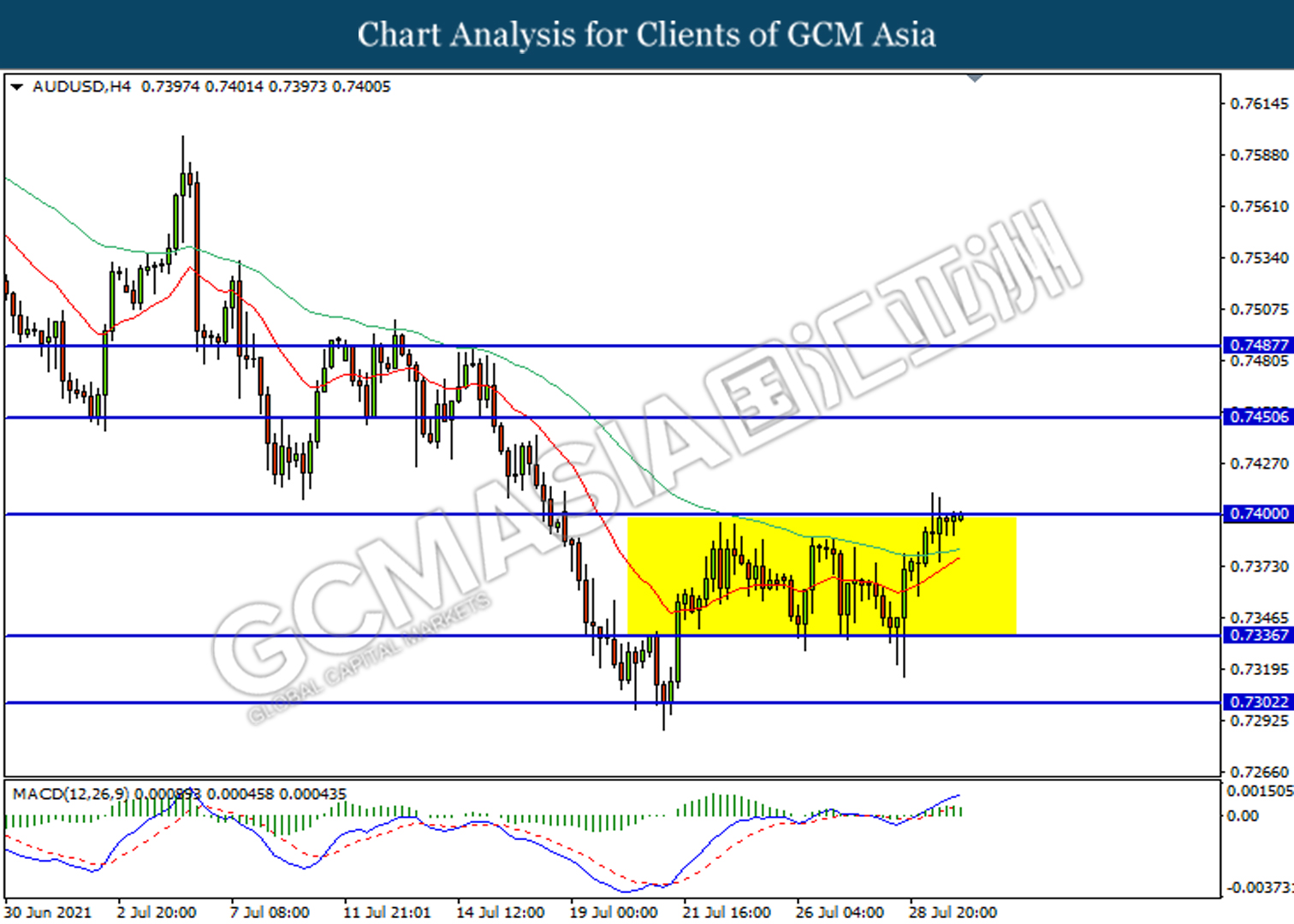 AUDUSD, H4: AUDUSD was traded higher following a rebound from lower levels. MACD which shows bullish momentum suggests the pair to extend its gains after breaking the resistance level.