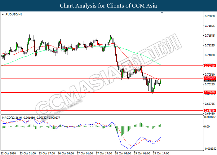 AUDUSD, H1: AUDUSD was traded higher while currently testing the resistance level at 0.7040. MACD which illustrated increasing bullish momentum suggest the pair to extend its gains after it successfully breakout above the resistance level.