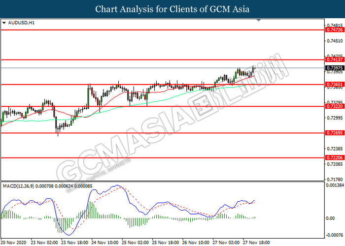 AUDUSD, H1: AUDUSD was traded higher while currently near the resistance level at 0.7415. MACD which illustrated increasing bullish momentum suggest the pair to extend its gains after it successfully breakout above the resistance level.