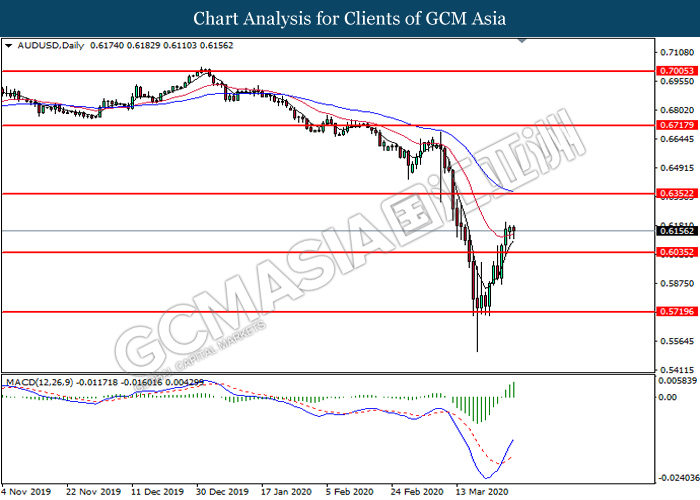 AUDUSD, Daily: AUDUSD was traded higher following prior breakout above the previous resistance level at 0.6035. MACD which illustrate bullish bias momentum suggest the pair to extend its gains toward the resistance level at 0.6350.