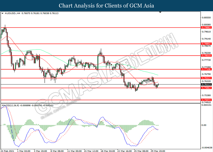 AUDUSD, H4: AUDUSD was traded lower while currently testing the support level at 0.7585. MACD which illustrated diminishing bullish momentum suggest the pair to extend its losses after it successfully breakout below the support level.