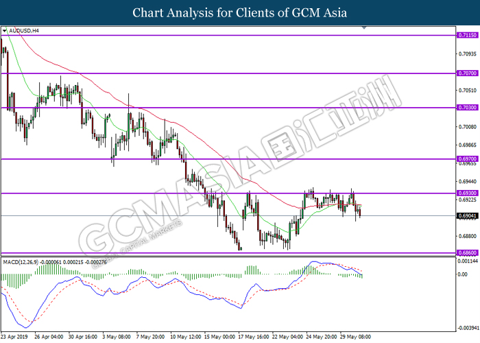 AUDUSD, H4: AUDUSD was traded lower following prior retracement from the resistance level 0.6930. MACD which illustrate bearish momentum suggest the pair to extend its retracement towards the support level 0.6860.