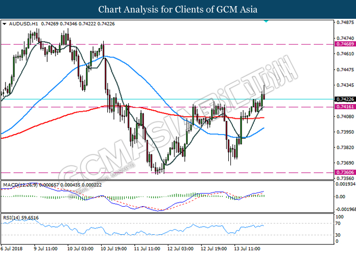 AUDUSD, H1: AUDUSD was traded higher following prior breakout from the support line 0.74161. Recent price action and both indicators MACD and RSI display ongoing bullish momentum suggest the pair could extend its gains towards the resistance level 0.7470.