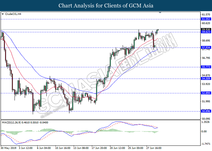 CrudeOIL, H4: Crude oil price was traded higher following prior breakout above the previous resistance level 59.60. MACD which illustrate bullish bias signal with the starting formation of golden cross suggest the commodity to extend its gains towards the resistance level 61.05.