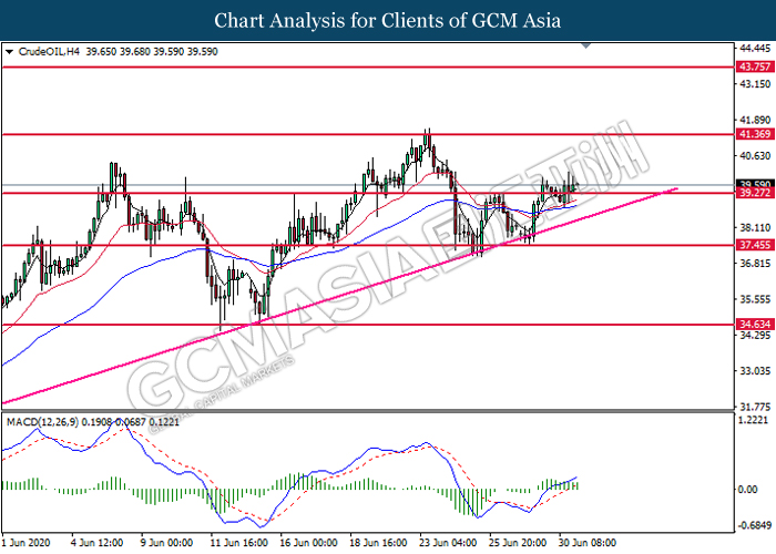 CrudeOIL, H4: Crude oil price was traded higher following prior breakout above the previous resistance level at 39.25. MACD which illustrate bullish bias momentum signal suggest the commodity to extend its gains toward the resistance level at 41.35.