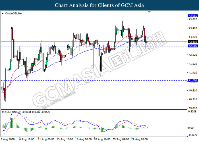 CrudeOIL, H4: Crude oil price was traded lower while currently testing the support level 42.60. MACD which illustrate bearish bias signal suggest the commodity to extend its losses after it breaks below the support level 42.60.