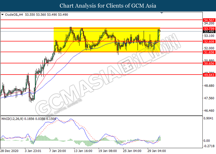 CrudeOIL, H4: Crude oil price was traded higher while currently testing the resistance level at 53.75. MACD which illustrated bullish bias momentum suggest the commodity to extend its gains after it successfully breakout above the resistance level at 53.75.