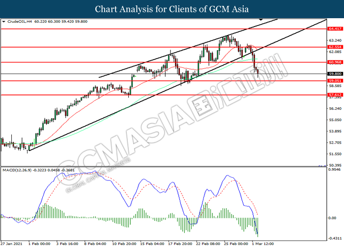 CrudeOIL, H4: Crude oil price was traded lower following prior breakout below the previous support level at 60.95. MACD which illustrated increasing bearish momentum suggest the commodity to extend its losses toward support level at 59.05.